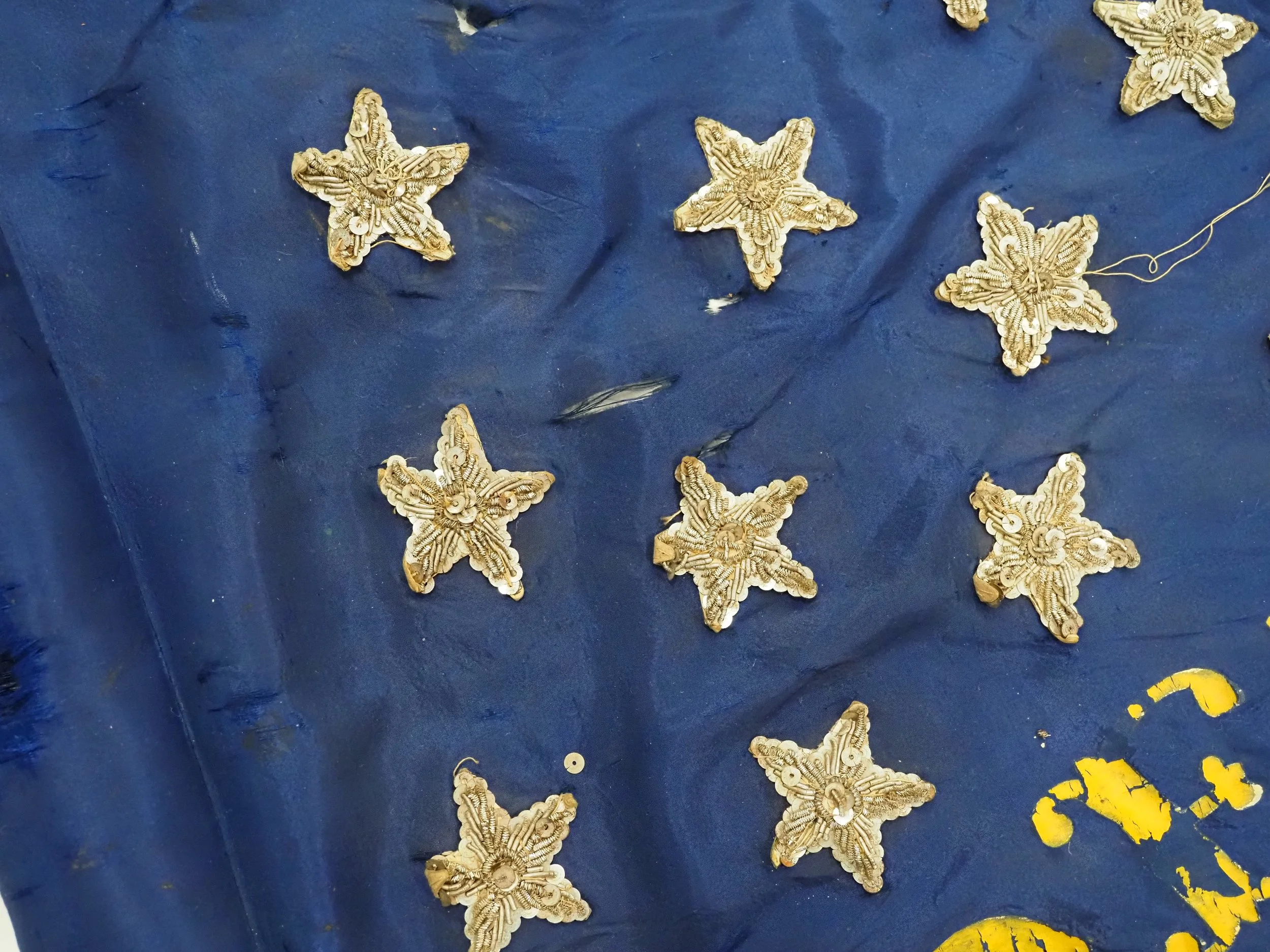 The flag has five pointed painted stars arranged in two concentric ovals; however, there is too much loss in the canton to determine if this is an early war (34 star) or late war (35 star) flag. Flags with this oval pattern typically had an outer oval of twenty stars, an inner oval of ten stars, one star in each corner, and one in the middle for a 35-star flag. For a 34-star flag, the middle star is omitted. There is gold fringe on the outer edge of the flag, but the fringe on the fly edge appears to be a more recent replacement as it does not match the rest of the flag’s fringe. Fabric on the hoist was fashioned into a sleeve for attachment to the staff.