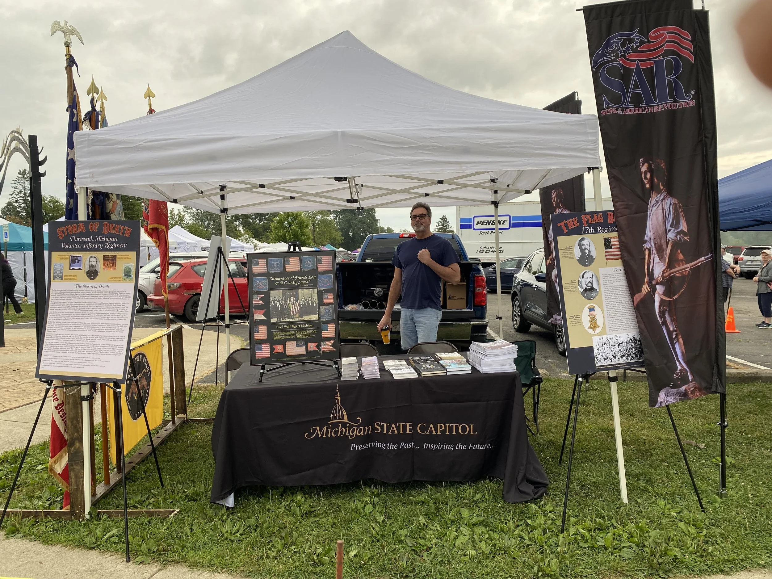 Below is Jerry Benson, Capitol Educator extraordinaire, striking his “Heroic” pose at the Save The Flags tent at the Jackson, MI Civil War Muster.