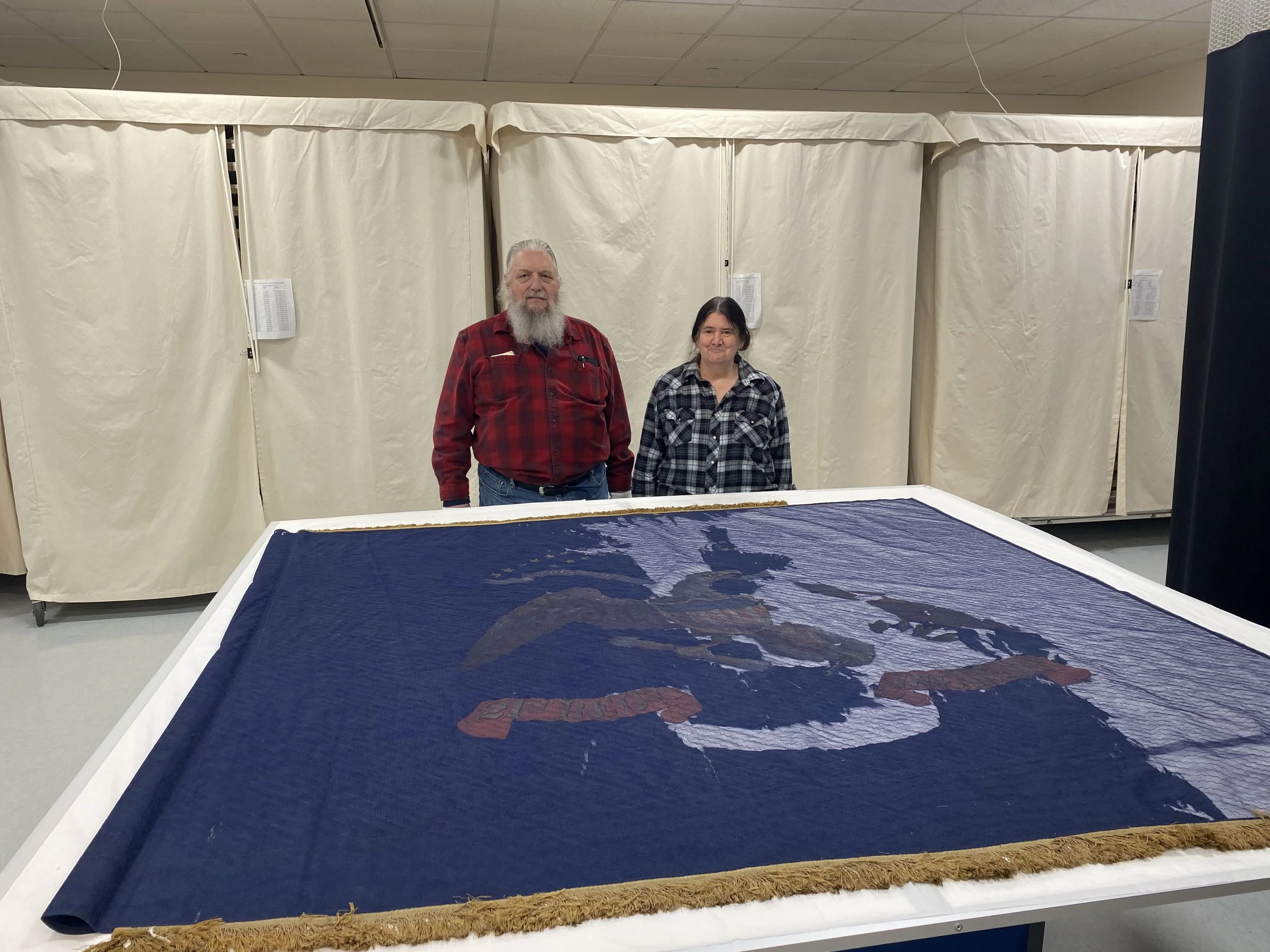 (left) Joel and Sue next to the national flag of the 10th Michigan Infantry Regiment. (center) Joel and Sue next to their newly adopted regimental flag of the 21st Michigan Infantry Regiment. (right) Adopted flag of the 21st Michigan Infantry Regiment.