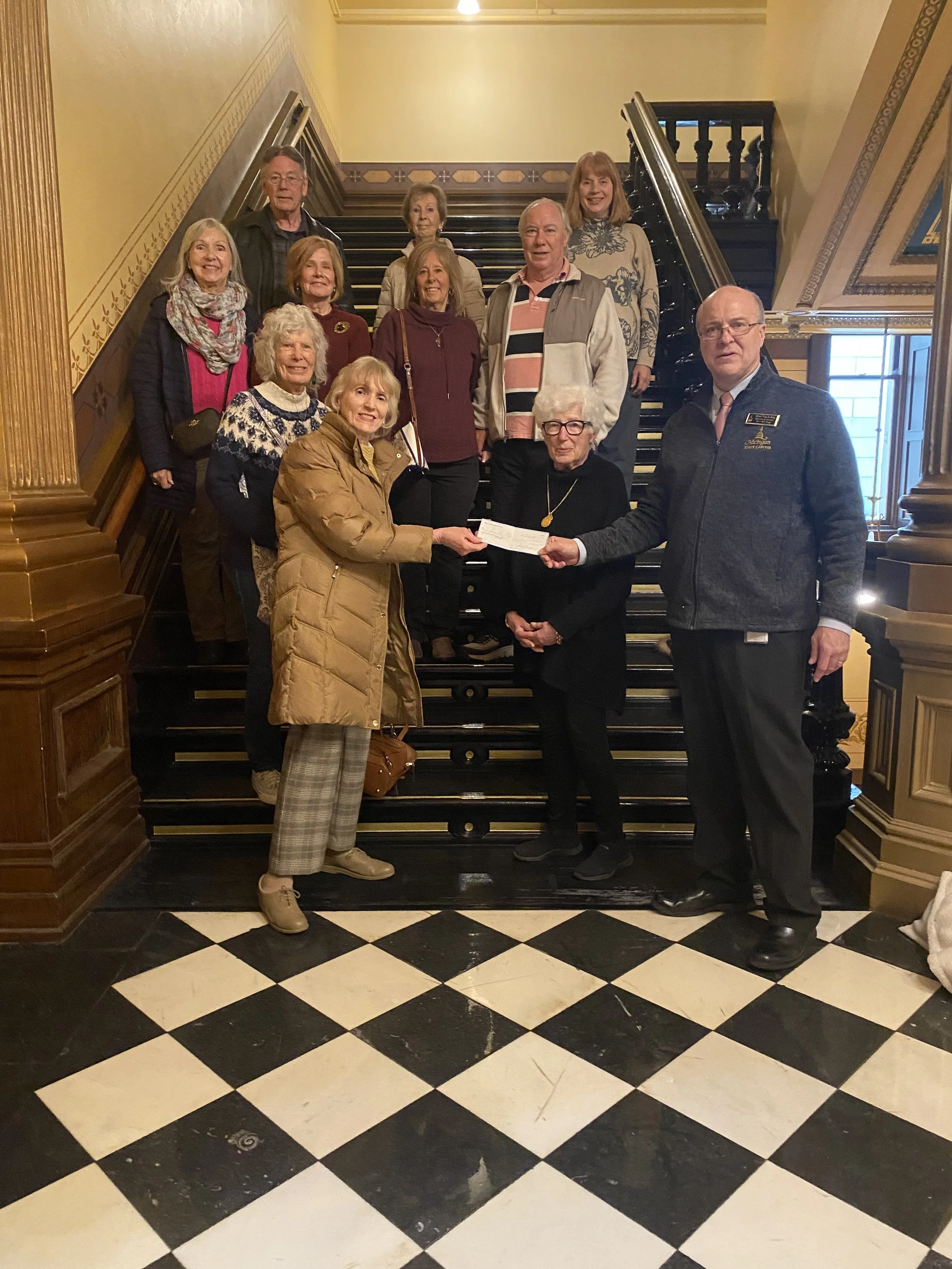 Save the Flags hosted the John W. Hunter Questers Chapter for a Capitol tour and a visit to the flag storage unit on March 18, 2026. The Hunter Questers are steadfast supporters of the flag conservation project, including a flag adoption in 2001 of the First Michigan Cavalry and their most recent support (featured in the photo). Individual Quester members and Chapters across the state and the nation have become dear friends of Save the Flags and we are in their debt for their continued and dedicated support.