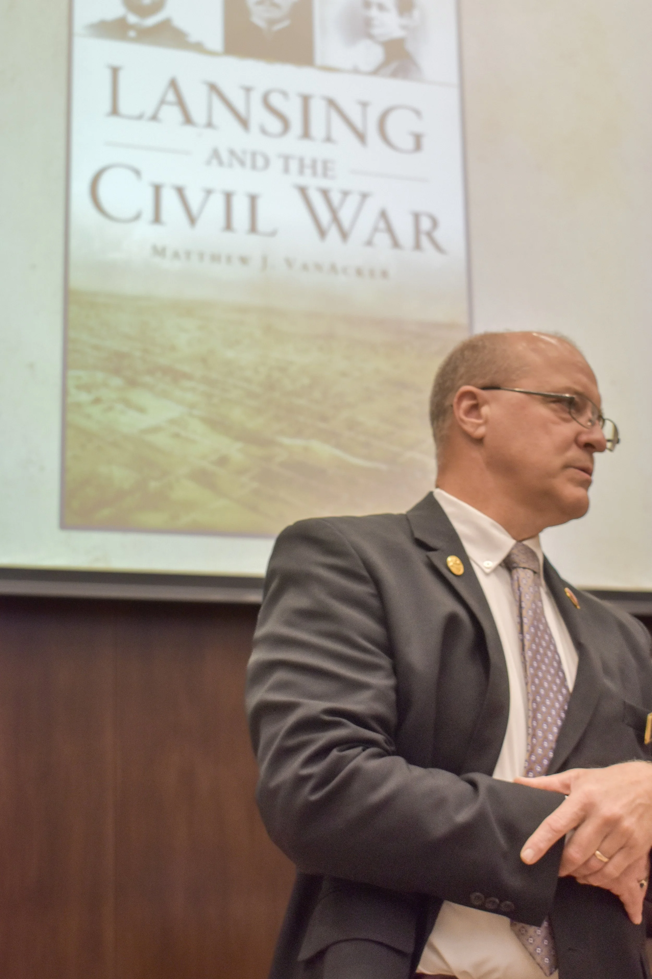(right) Members of the Lansing League of Women Voters visiting the Heritage Hall conservation lab. (left) Lansing and the Civil War book talk in the south state room of Heritage Hall.